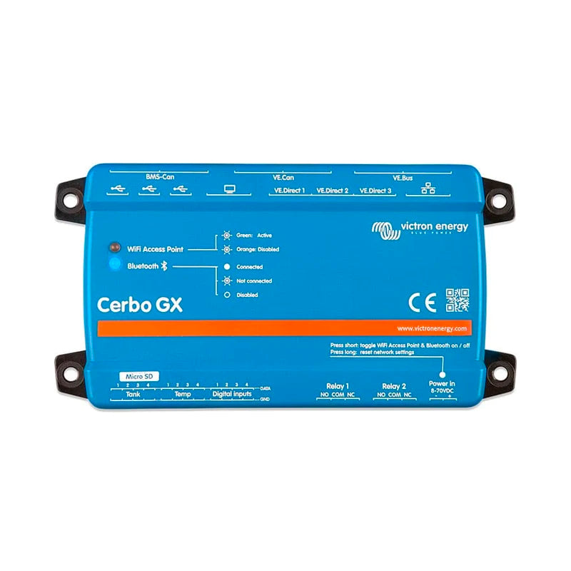 Le Cerbo GX maximise la performance des composants de votre système en temps réel et les maintient en parfait état. Avec son processeur Dual Core et l'ajout d'un port CAN-bus supplémentaire, vous pouvez désormais prendre en charge des systèmes encore plus importants ; suivre de près les batteries (lithium) gérées tandis que le second port peut prendre en charge jusqu'à 25 chargeurs solaires VE.Can connectés simultanément. Le nouveau support NMEA 2000-out permet au GX de s'intégrer facilement dans le réseau de n'importe quel bateau. Quatre ports de réservoir et quatre ports de température ainsi que 3 ports VE.Direct, 3 ports USB, 4 entrées numériques et 2 relais vous permettent d'étendre le contrôle à un niveau supérieur.