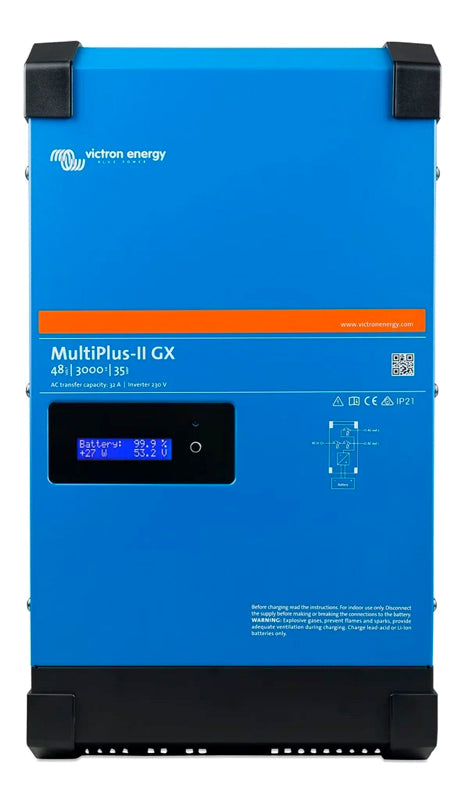 Le MultiPlus-II combine les fonctions du MultiPlus et du MultiGrid. Il possède toutes les caractéristiques du MultiPlus, plus un transformateur de courant externe en option pour mettre en œuvre PowerControl et PowerAssist et pour optimiser l'autoconsommation avec une détection de courant externe (max. 32A).