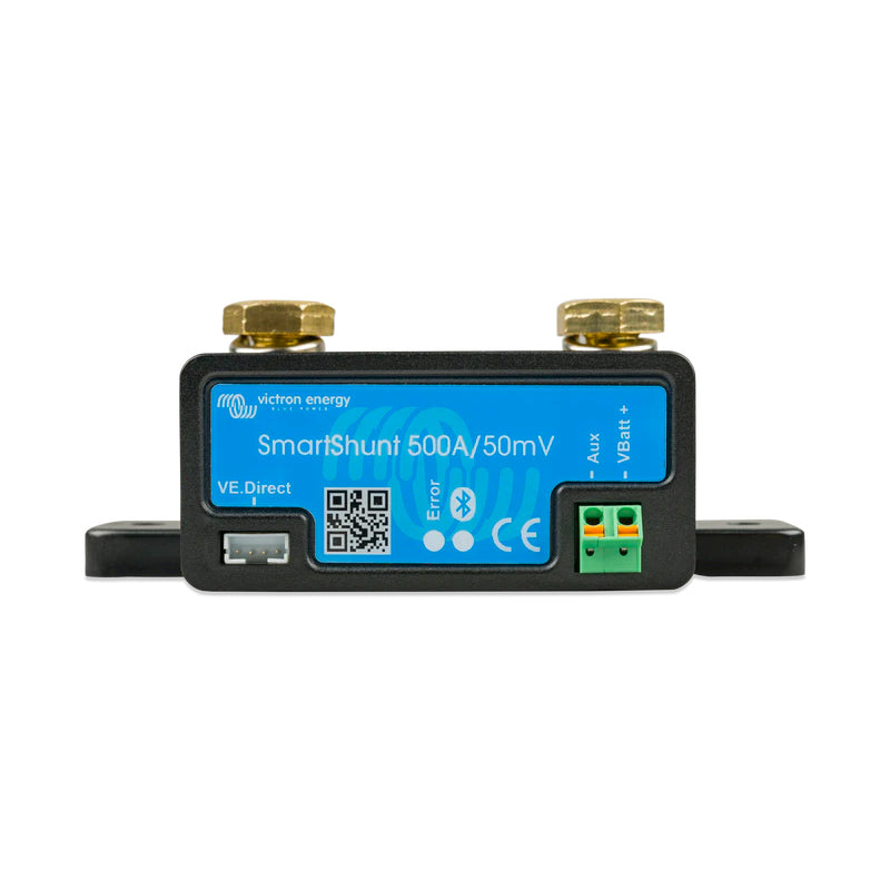 Le SmartShunt est une bonne alternative au moniteur de batterie BMV, en particulier pour les systèmes où la surveillance de la batterie est nécessaire mais où l'on souhaite moins de câblage et d'encombrement. Le SmartShunt est équipé de Bluetooth, d'un port VE.Direct et d'une connexion qui peut être utilisée pour : la surveillance d'une deuxième batterie, la surveillance du point médian ou un capteur de température.