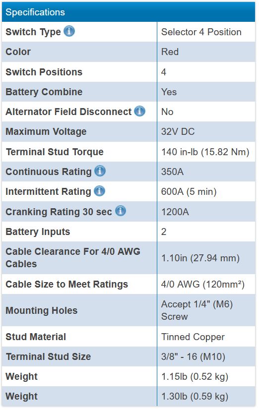 - The "make-before-break" contact design allows you to switch battery banks without interruption.