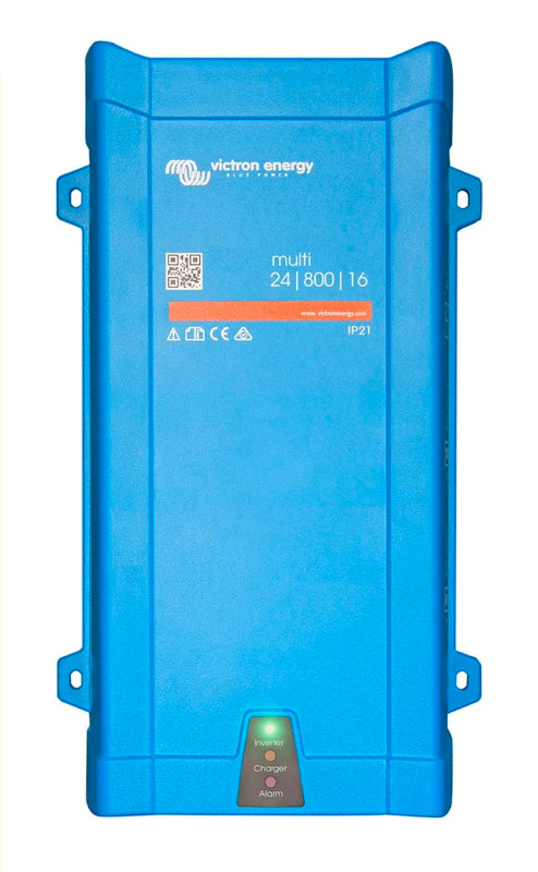 The MultiPlus is a powerful sine wave inverter, sophisticated battery charger with adaptive charging technology and high-speed AC transfer switch in one compact package. Models range from 800VA to 5000VA per module.