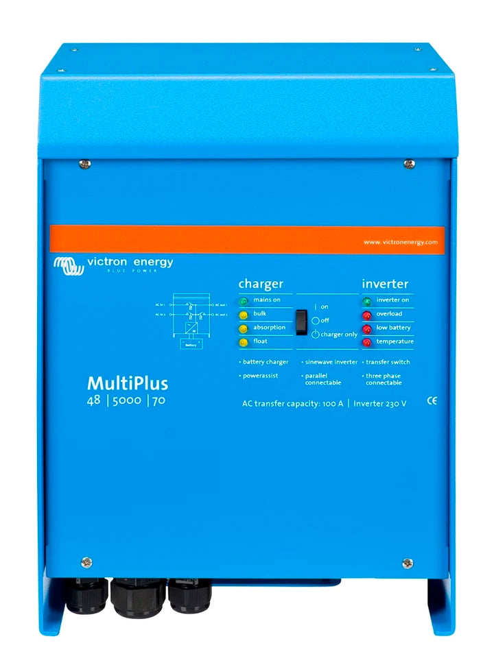 The MultiPlus is a powerful sine wave inverter, sophisticated battery charger with adaptive charging technology and high-speed AC transfer switch in one compact package. Models range from 800VA to 5000VA per module.